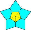 Útvar na obrázku je vytvorený z piatich zhodných azúrových kosoštvorcov a jedného žltého pravidelného päťuholníka, ktorý kosoštvorce čiastočne prekrýva. Kosoštvorce susedia celými stranami a na týchto stranách ležia vrcholy päťuholníka. Pomer dĺžky polomeru kružnice opísanej päťuholníku a dĺžky strany kosoštvorca je 4 ∶ 7.